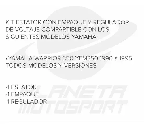 Producto: Estator Empaque Regulador Kit Yamaha Warrior 350 1990-1995.